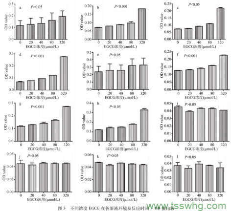 小同濃度的EGCG(0、20、40、80、320μmol/L)分別以H20、RPMI1640、DMEM(pH=7)三種溶液體系,反應3、6、12、24h。結(jié)果顯示,以H20為溶液的各EGCG濃度組問無顯著差異(圖3i,i,k,1);以RPMI1640和DMEM為溶液體系的3h組,各濃度間也無顯著差異(圖3a,e),其余各組均隨著EGCG濃度的升高,OD578顯著上升(P<0.05)(圖3b,c,d,f,g,h),即高濃度促進EGCG的氧化聚合。