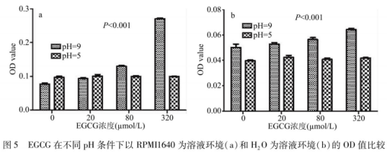 實驗設置了pH=5和9探討pH對EGCG氧化聚合的影響,選用RPMI1640和H20兩種溶液條件,37℃時分別比較了不同pH條件下的OD值變化。如圖5a所示,以RPMll640作為溶液環(huán)境,各濃度下兩種pH的OD578均有極顯著差異(P<0.001),pH=5時各濃度組OD。變化不顯著(P>0.05);pH=9時OD578隨著EGCG濃度的升高顯著增大(P<0.05)。當以H20作為溶液環(huán)境,pH=5各濃度OD578值均極顯著低于pH=9的OD578值(P<0.001),如圖5b,綜合各組結(jié)果,堿性環(huán)境較酸性環(huán)境促進EGCG的氧化聚合。
