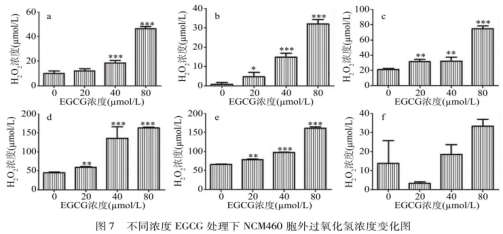 對(duì)比不同處理時(shí)間點(diǎn)發(fā)現(xiàn),胞內(nèi)H202濃度呈現(xiàn)先上升后下降的趨勢(shì);與對(duì)照組0μmol/L相比,H202濃度lh內(nèi)出現(xiàn)了短暫增高,其中80μmol/L組極顯著增高(P<0.001)(圖6a),處理3h后,與對(duì)照組相比高濃度EGCG中的H202濃度出現(xiàn)顯著下降(P<0.05)(圖6c),這種現(xiàn)象在處理12h后更顯著(P<0.001)(圖6d)。