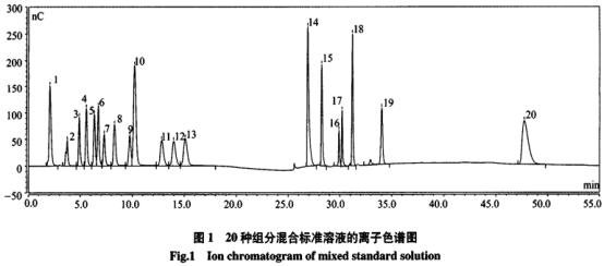 依次考察了0.20、0.25、0.275、0.30mL/min四個流速條件下的組分分離狀況。結果表明,0.20mL/min時系統(tǒng)壓力較小,峰寬較大,峰靈敏度下降,整體分離度不高;0.30mL/min時系統(tǒng)初始壓力高達19.2MPa,35min時系統(tǒng)壓力超過上限20.7MPa;O.25和0.275mL/min流速時,26種組分靈敏度和分離度均很理想,但0.275mL/min時最高壓力為19.6MPa,接近系統(tǒng)壓力上限,壓力過大易導致色譜柱塌陷或者系統(tǒng)漏液,影響整個檢測系統(tǒng)運行的(2)梯度淋洗條件的選擇一般淋洗梯度條件難以實現20種氨基酸組分的有效分離,為提高檢測靈敏度和色譜峰分離度,先后根據不同淋洗時間段、不同淋洗濃度、不同淋洗斜率進行了30多次實驗研究分析,最終根據分離效果和基線穩(wěn)定性選取了表1中多級梯度淋洗條件。從表1中可以看出,色譜分離淋洗時間被分成5段(0~12min、12~16min、16~24min、24~40min、40~50min),初始淋洗濃度是整個多級梯度淋洗條件的基礎,因此在0~12min采用的是50mmol/L氫氧化鈉淋洗液,恰好能夠實現前10種弱保留組分有效分離。在12~16min時間段,選擇斜率為7.00mmol/(L·min)濃度氫氧化鈉淋洗液梯度,可確保組分11至組分13有效分離;在16~24min時間段,開始使用較強淋洗溶液醋酸鈉溶液,為中強保留組分洗脫和分離做好準備。在24~40min時間段,選取氫氧化鈉溶液、醋酸鈉溶液、去離子水配比(24:40:36)的梯度淋洗溶液進行洗脫,確保了組分14~19的有效分離。在40~50min時間段中,為使強保留組分色氨酸快速洗脫,選擇了氫氧化鈉溶液、醋酸鈉溶液配比(50:50)濃度的洗脫液,圖1是20種氨基酸混合標準溶液離子色譜圖。