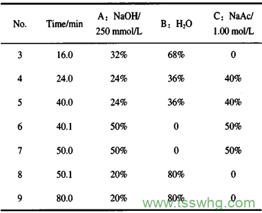 離子色譜儀:ICS5000+;色譜柱:AminoPacPAl0(2×250mm),保護柱:AminoPacPAl0(2×50mm);積分安培檢測;工作電極:Gold(au)-AAA;參比電極:pH電極;電位波形:G10d,pH-Ag-AgClRE,舭A;流動相:A-NaOH溶液,B-去離子水,C-醋酸鈉溶液;流速:0.25mL/min;柱溫:30℃;進樣量:25μL。