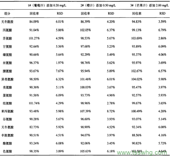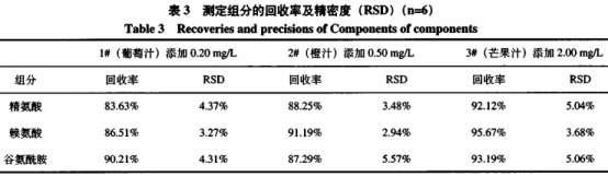 從表3中可以看出,在0.20mg/L和0.50mg/L添加濃度水平下,精氨酸、賴氨酸、谷氨酰胺、天冬酰胺、天冬氨酸的回收率相對較低,回收率多數(shù)在82%~90%之間,但依然滿足食品理化檢驗技術要求(測定含量小于O.10mg/L,回收率應在60%~120%)。20種組分三濃度水平添加回收率在82.73%~107.39%之間,RSD在1.97%~8.72%范圍內(nèi),這說明20種氨基酸測定回收率好。從總體上來看,三種基質(zhì)、六次平行測定回收率數(shù)據(jù)結(jié)果符合食品理化檢測要求,表明方法準確性高、精密度好。
