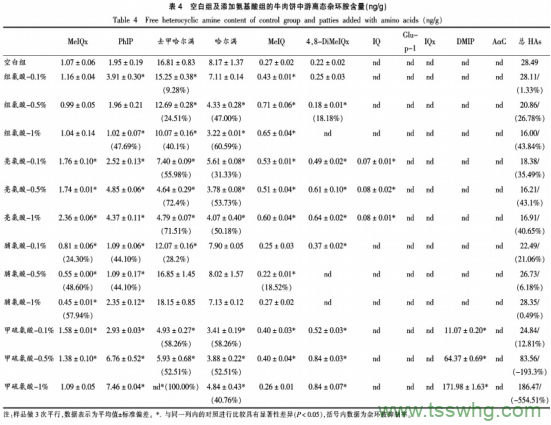 有研究發(fā)現(xiàn),組氨酸、亮氨酸、甲硫氨酸和脯氨酸的MRP的自由基(ABTS)清除活性比單獨加熱氨基酸產(chǎn)生的物質(zhì)高13~70倍。Yu等表明葡萄糖和組氨酸的MRP具有強過氧自由基清除活性和較強的抗氧化活性。本試驗中。4種抑制劑氨基酸與肉餅中的糖類結(jié)合,產(chǎn)生的MRP同樣可以清除參與雜環(huán)胺生成的自由基,這4種氨基酸抑制劑便可通過自由基消除途徑抑制雜環(huán)胺的產(chǎn)生。以上假設(shè)是否成立,除了自由基途徑是否還存在其它抑制途徑,以及哪些抑制劑傾向于通過哪些途徑抑制雜環(huán)胺產(chǎn)生。都未明晰。需進一步研究。接下來的試驗將通過建立成分更加簡單的模擬體系。監(jiān)測雜環(huán)胺前體,可能目標中間體及其終產(chǎn)物,進而探究不同氨基酸對不同種類雜環(huán)胺產(chǎn)生抑制作用的途徑和機理。