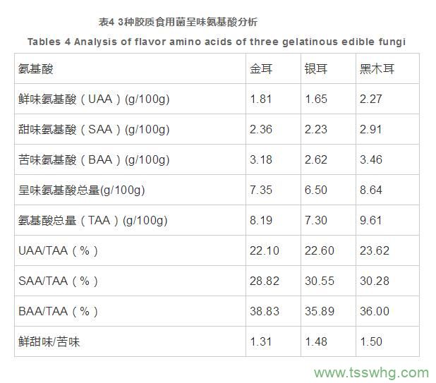 通過分析金耳、銀耳、黑木耳3種膠質(zhì)食用菌的營養(yǎng)成分可知,3種膠質(zhì)食用菌的基本營養(yǎng)成分含量存在差異,但均含有豐富的糖類、蛋白質(zhì)、礦物質(zhì)等營養(yǎng)成分,低脂肪,高纖維含量,并且含有17種氨基酸,其中包含人體必需氨基酸7種。谷氨酸和天門冬氨酸等鮮味氨基酸含量較高,通過呈味氨基酸含量分析可知,鮮甜味氨基酸的總量占苦味氨基酸的比例為1.31 ~1.50倍之間,表明3種膠質(zhì)食用菌都是以鮮甜味氨基酸為主。3種膠質(zhì)食用菌的必需氨基酸占總氨基酸的質(zhì)量分數(shù)均高于FAO/WHO氨基酸模式譜,其SRC 值由高到低分別為銀耳(82.25)>黑木耳(78.09)>金耳(77.98),均在80左右,營養(yǎng)價值與利用率較高。綜合分析認為:3種膠質(zhì)食用菌蛋白質(zhì)營養(yǎng)價值差別不明顯,都是含有較高蛋白質(zhì),低脂肪、高纖維、高總糖含量的菌類,具有較高營養(yǎng)價值和保健食品開發(fā)前景。