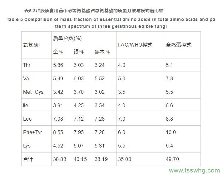 本研究將3種膠質(zhì)食用菌必需氨基酸 EAA 值與FAO/WHO模式譜和優(yōu)質(zhì)蛋白質(zhì)全雞蛋模式譜中相應氨基酸的 EAA值進行比較,結(jié)果見表5。3種膠質(zhì)食用菌的必需氨基酸總量均高于FAO/WHO氨基酸模式,低于優(yōu)質(zhì)蛋白質(zhì)全雞蛋模式。銀耳中除Lys比FAO/WHO模式譜稍低外,其他必需氨基酸的EAA值均高于FAO/WHO模式譜;金耳、黑木耳中Met+Cys、Ile和Lys的EAA值低于FAO/WHO模式譜,Thr、Val、Leu、Phe+Tyr的EAA值均高于 FAO/WHO模式譜。跟全雞蛋模式譜相比,3種膠質(zhì)食用菌樣品除了Thr高于全雞蛋模式外,其他必需氨基酸的EAA 值均低于模式譜。一般來說,植物性蛋白常相對缺少賴氨酸、蛋氨酸、蘇氨酸和色氨酸等必需氨基酸,所以其營養(yǎng)價值相對較低。而檢測發(fā)現(xiàn)3種膠質(zhì)食用菌中的蘇氨酸含量較高,都高于FAO/WHO模式譜和優(yōu)質(zhì)蛋白質(zhì)全雞蛋模式譜中蘇氨酸的 EAA值,而蘇氨酸又是小麥、大米、燕麥等主食的第二限制氨基酸。在實際應用中,可考慮將食用菌和主食或其他食物混合食用,以實現(xiàn)蛋白質(zhì)的互補作用,提高食物蛋白質(zhì)營養(yǎng)價值。