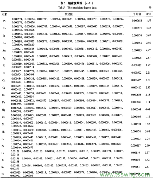 本實(shí)驗(yàn)平行稱取硫酸鈀溶液11份,各加入0.1μg/mL(Ca、K、Na、si加入0.2μg,mL)所測(cè)元素標(biāo)準(zhǔn)儲(chǔ)備液,按實(shí)驗(yàn)方法處理后進(jìn)行測(cè)定,統(tǒng)計(jì)各雜質(zhì)元素的相對(duì)標(biāo)準(zhǔn)偏差驗(yàn)證方法精密度,結(jié)果見表5,從中可以看出,方法精密度在1.14%~4.64%之間。