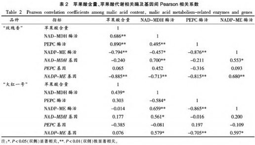 相關(guān)性分析結(jié)果(表2)表明,“玫瑰香”品種火龍果的NAD-MDH和PEPC活性與蘋(píng)果酸含量呈極顯著正相關(guān)(P<0.01),NADP-ME活性與蘋(píng)果酸含量呈極顯著負(fù)相關(guān)(P<0.01):“大紅一號(hào)”品種火龍果的NAD-MDH活性與蘋(píng)果酸含量呈顯著正相關(guān)(P<0.05),PEPC活性與蘋(píng)果酸含量呈正相關(guān),NADP-ME活性與蘋(píng)果酸含量呈負(fù)相關(guān)。