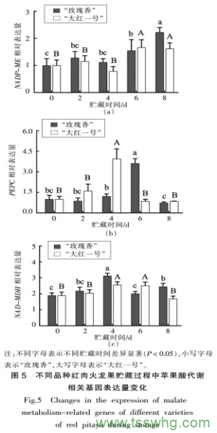 紅肉火龍果采后品質(zhì)劣變由果皮和果肉硬度下降及可滴定酸、抗壞血酸、總酚含量降低共同導(dǎo)致。蘋(píng)果酸為紅肉火龍果果實(shí)中有機(jī)酸的主要成分,其含量變化導(dǎo)致果實(shí)有機(jī)酸含量下降。負(fù)責(zé)蘋(píng)果酸合成的NAD-MDH和PEPC的酶活性與蘋(píng)果酸含量呈正相關(guān)。而負(fù)責(zé)蘋(píng)果酸降解的NADP-ME則與蘋(píng)果酸含量呈負(fù)相關(guān)。進(jìn)一步研究測(cè)定蘋(píng)果酸相關(guān)代謝酶NADP-ME、PEPC和NAD-MDH基因水平變化,發(fā)現(xiàn)蘋(píng)果酸代謝相關(guān)基因水平的變化與酶活的變化趨勢(shì)一致。火龍果采后貯藏過(guò)程中,PEPC和NAD-MDH的基因水平呈下降趨勢(shì),而NAD-MDH的基因水平呈上升趨勢(shì),使得果實(shí)中蘋(píng)果酸合成受阻,降解加劇,最終導(dǎo)致蘋(píng)果酸含量下降,火龍果在貯藏過(guò)程中品質(zhì)變劣。