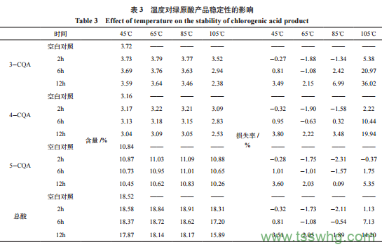 由表3可知,從45℃~105℃,甜葉菊綠原酸類成分受熱溫度越高、時(shí)間越長,含量減少越多;其中3-CQA的含量減少最多,4-CQA次之,5-CQA減少最少。45℃~85℃范圍內(nèi),甜葉菊綠原酸類成分損失率相近,105℃下甜葉菊綠原酸類成分損失率明顯升高。