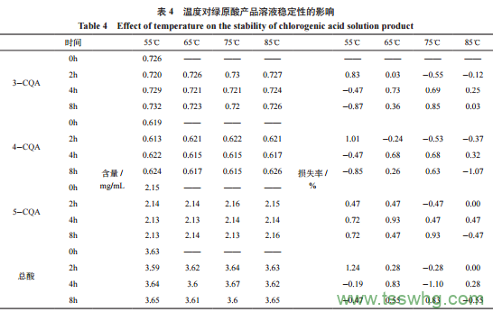 在不同溫度下加熱2h、4h、8h,3-CQA、4-CQA、5-CQA含量和總酸含量均在一定范圍內(nèi)波動(dòng),可以認(rèn)為在55℃~85℃下,加熱8h對(duì)綠原酸產(chǎn)品溶液穩(wěn)定性無影響。