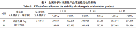 溶液中金屬離子和綠原酸的摩爾比為3∶50、3∶25和6∶25時(shí),綠原酸的損失率<7%,4h和0h相比基本沒有變化??梢哉J(rèn)為金屬離子的加入會(huì)引起綠原酸少量損失。