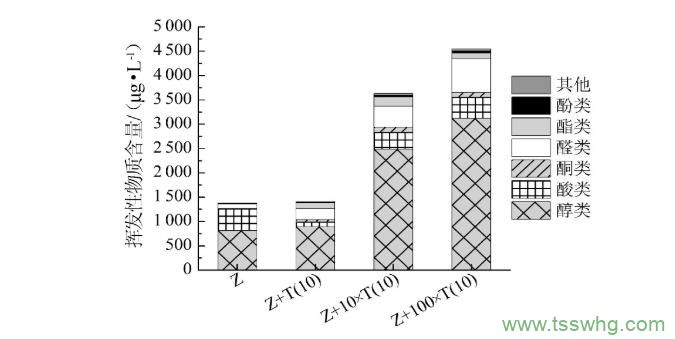 進一步對模擬低鹽快速發(fā)酵醬油中揮發(fā)性物質(zhì)含量進行分析,結(jié)果見圖5。由圖5可知,不同發(fā)酵方式的醬油樣品中揮發(fā)性風味物質(zhì)含量有明顯差異。在發(fā)酵過程中共同添加嗜鹽四聯(lián)球菌和魯氏接合酵母,由于兩菌的協(xié)同作用,顯著提高了醬油中揮發(fā)性風味物質(zhì)的含量。發(fā)酵開始添加魯氏接合酵母并在10d添加107CFU/g或者108CFU/g嗜鹽四聯(lián)球菌醬油樣品中揮發(fā)性物質(zhì)含量比單獨添加酵母菌醬油的樣品分別高1.7倍和2.4倍。