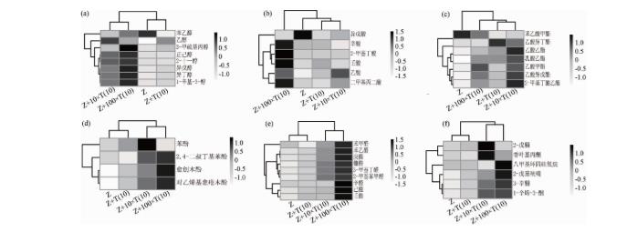 為進一步揭示嗜鹽四聯(lián)球菌和魯氏接合酵母通過協(xié)同作用對醬油風味的貢獻,通過文獻總結(jié),對醬油中主要風味物質(zhì)進行聚類分析來鑒別與所強化菌株相關(guān)的風味物質(zhì)合成,結(jié)果見圖6。由圖6可知,模擬低鹽快速發(fā)酵醬油樣品中含量較多的醇類化合物主要有乙醇、異丁醇、異戊醇、1-辛烯-3-醇、2-十一醇、苯乙醇等,嗜鹽四聯(lián)球菌的添加量對這些醇類含量的增加起到重要作用(圖6a),其中發(fā)酵開始添加魯氏接合酵母并在10d添加107CFU/g或者108CFU/g嗜鹽四聯(lián)球菌醬油樣品中1-辛烯-3-醇含量比單獨添加酵母菌分別提高了6.4倍和8.9倍。