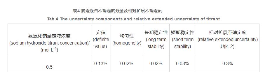 滴定液定值濃度的合成相對標準的不確定度見表3。