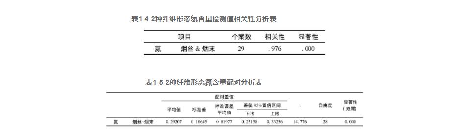 由表13、14可知,對于氮含量檢測值,絲狀與粉狀2種形態(tài)的檢測結(jié)果存在著極顯著相關(guān),并在P=0.05的水平上存在著極顯著性差異。