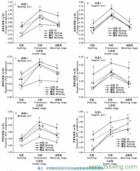 鉀積累變化趨勢在2種土壤上的表現(xiàn)略有不同,麻城土表現(xiàn)為先升后降,花期仍為最大積累時期,焚燒、翻壓和覆蓋處理的積累量分別達1.918,1.991,2.099g/盆,分別比CK提高15.6%,20.0%,26.5%;成熟期積累量有所下降,但覆蓋處理的總積累量仍有1.925g/盆,比CK提高28.3%。陽邏土整體表現(xiàn)為持續(xù)增加(翻壓處理成熟期略有下降除外),但不同稻稈還田處理表現(xiàn)不一,覆蓋處理均有促進作用(苗期、花期和成熟期分別提高27.7%,13.5%,6.6%),翻壓處理苗期、花期有促進作用,成熟期反而低于CK;焚燒處理則花期和成熟期均低于CK(圖2-E、F)。
