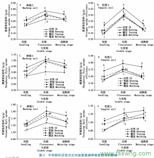 磷吸收效率變化趨勢與氮基本一致,也是花期為最大吸收效率期,相比CK,覆蓋處理的磷吸收效率苗期、花期和成熟期,麻城土分別提高19.8%,26.0%,18.9%,陽邏土分別提高24.8%,11.2%,24.4%,2種土壤平均提高22.3%,18.6%,21.7%,差異均顯著(圖3-C、D)。各器官的磷吸收效率(圖4-C、D)在2種土壤上的表現(xiàn)基本一致,苗期葉>根,花期莖>花>根>葉,成熟期麻城土籽粒>莖>根>殼,陽邏土籽粒>莖>殼>根;成熟期,無論是麻城土還是陽邏土,油菜莖的磷素吸收效率,覆蓋處理均顯著高于其他3個處理。鉀吸收效率麻萬方數(shù)據(jù)城土花期為最大吸收時期,陽邏土則成熟期為最大吸收時期,相比CK,苗期、花期和成熟期的鉀吸收效率,覆蓋處理麻城土分別提高17.9%,26.5%,28.3%,陽邏土分別提高27.7%,13.5%,6.6%,2種土壤平均提高22.8%,20.0%,17.5%,差異均顯著(圖3-E、F)。各器官的鉀吸收效率(圖4-E、F)在2種土壤上的表現(xiàn)基本一致,苗期葉>根,花期莖>根>花>葉,成熟期莖>殼>根>籽粒;與氮素吸收效率相一致,成熟期覆蓋處理的鉀吸收效率,麻城土是莖稈顯著高于其他3個處理,陽邏土則是籽粒顯著高于其他3個處理。