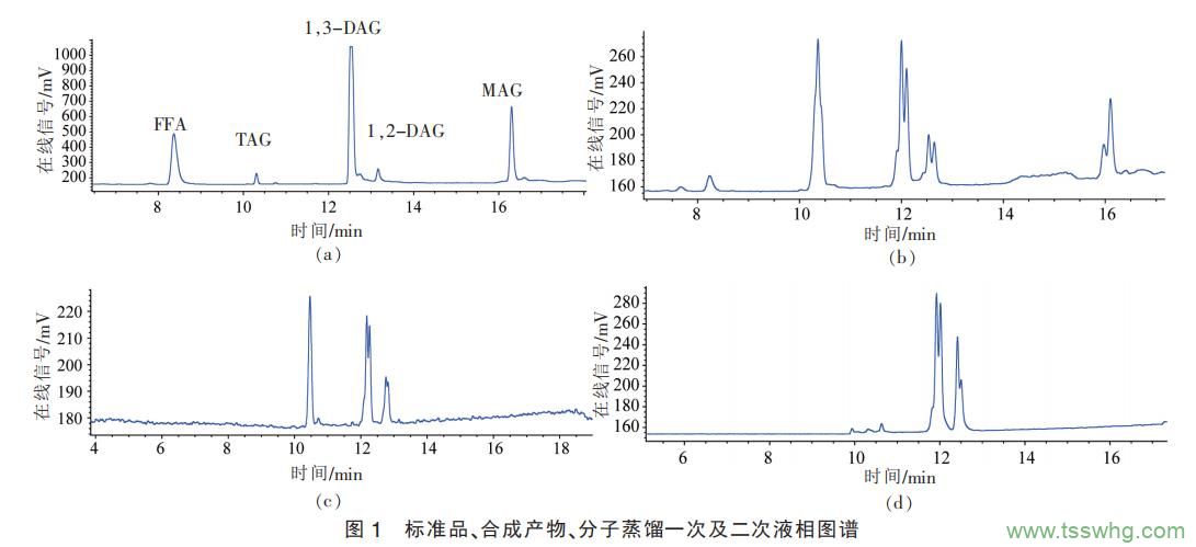 圖1分別為混合甘油酯標準品、合成甘油酯及分子蒸餾一次和二次的液相圖譜,橫坐標為時間,縱坐標為響應信號,出峰順序依次為FFA、TAG、1,3-DAG、1,2-DAG和MAG,分離效果很好。分子蒸餾一次后可除去游離脂肪酸和甘油一酯。分子蒸餾二次后可只保留甘油二酯組分。