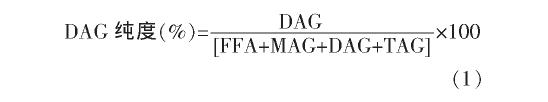 式中,MAG(%)———產物中甘油一酯含量;DAG(%)———產物中甘油二酯含量;TAG(%)———產物中甘油三酯含量;FFA(%)———產物中游離脂肪酸的含量。