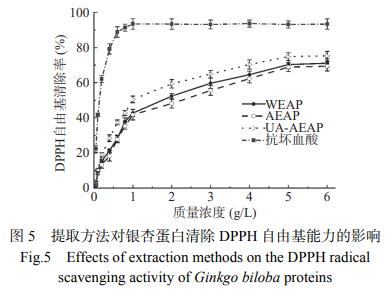 DPPH自由基清除能力是評估受試物抗氧化潛力的最常用方法之一,當(dāng)DPPH自由基被受試物清除時,DPPH溶液的吸光度會降低,因此可用于評估受試物的清除自由基能力。不同提取方法對銀杏蛋白清除DPPH自由基能力的影響如圖5所示。在0.05~6g/L的質(zhì)量濃度范圍內(nèi),三種銀杏蛋白的DPPH自由基清除率均與質(zhì)量濃度呈正相關(guān)。當(dāng)質(zhì)量濃度為1g/L時,WEAP、AEAP和UA-AEAP蛋白對DPPH自由基的清除率分別為42.61%±2.14%、41.63%±3.23%和50.47%±1.95%;當(dāng)質(zhì)量濃度升高至為5g/L時,清除率分別提高到70.45%±2.36%、68.78%±2.56%和74.92%±2.28%。與WEAP和AEAP蛋白相比,UA-AEAP蛋白具有更強(qiáng)的DPPH自由基清除能力,可能的原因是超聲處理能降低銀杏蛋白的聚集度,暴露出更多的與自由基作用的基團(tuán)。Ma等研究表明,超聲處理可提高β-乳球蛋白對DPPH自由基的清除能力,這與本研究的結(jié)果相一致。