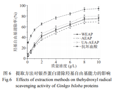 羥基自由基被認(rèn)為是目前已知的氧化能力最強(qiáng)和危害性最大的活性氧之一,可通過電子轉(zhuǎn)移、加成和脫氫作用攻擊機(jī)體內(nèi)多種生物分子,從而導(dǎo)致蛋白質(zhì)、核酸和脂質(zhì)的氧化損傷。圖6為不同提取方法對銀杏蛋白清除羥基自由基能力的影響。由圖可知,WEAP、AEAP和UA-AEAP蛋白對羥基自由基的清除活性與蛋白質(zhì)量濃度呈正相關(guān)。在質(zhì)量濃度為1.0g/L時,WEAP、AEAP和UA-AEAP蛋白對羥基的清除率分別為25.5%±0.82%、22.56%±0.74%和28.62%±1.21%;當(dāng)質(zhì)量濃度增加至8.0g/L時,清除率分別為73.96%±2.73%、68.52%±2.64%和78.94%±2.95%。由此可知,UA-AEAP蛋白具有更強(qiáng)的羥基自由基清除能力,這與前人研究結(jié)果相一致,大豆球蛋白經(jīng)超聲預(yù)處理后對羥基自由基的清除能力顯著增強(qiáng)。銀杏蛋白對羥基自由基的清除能力可能是因?yàn)榘被釟埢械聂然然鶊F(tuán)通過螯合亞鐵離子而阻斷Fenton反應(yīng),從而降低羥基自由基的產(chǎn)生。