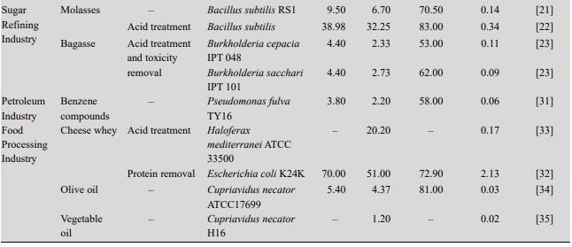 除此之外,表1中還列舉了其他可以用于低成本PHAs生產(chǎn)的碳源,例如石油煉制過程中的甲苯、乙苯、二甲苯等苯系化合物、奶酪加工過程中的乳清,油炸食品加工過程中的廢棄橄欖油、棕櫚油、葵花籽油等植物油。用于微生物發(fā)酵生產(chǎn)低成本PHAs的理想碳源種類豐富,其中來自農(nóng)業(yè)、工業(yè)、城市排放和餐余垃圾的廢棄物料來源廣、體量大,更適用于低成本PHAs的生產(chǎn)。但是大部分廉價(jià)物料經(jīng)預(yù)處理后碳源濃度低、碳源成分復(fù)雜多樣、毒性化合物存在、生物量低等問題為后期發(fā)酵策略的開發(fā)提出了新的挑戰(zhàn)。