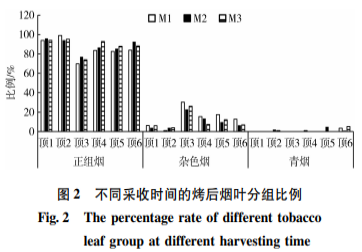將烤后煙葉分為正組煙、雜色煙和青煙葉等3個組別,分別統(tǒng)計其百分率(圖2)。M1~M3處理的正組煙葉比例分別在69.8%~99.0%、77.1%~96.1%、73.9%~95.2%,其平均值分別為85.5%、88.7%、88.7%,以M2、M3處理較高。不同處理的頂3~4、6葉位正組煙葉比例差異較大。從雜色煙葉組別看,M2、M3處理雜色煙葉比例最低,頂1~2葉位的雜色煙比例較低。從青煙葉組看,只有M2處理的相對較高。以上分析表明,頂3~6煙葉雜色煙葉比例較大,可能與煙葉成熟度差異大有關(guān);M2處理青煙比例大,可能與煙葉成熟度差異有關(guān)。