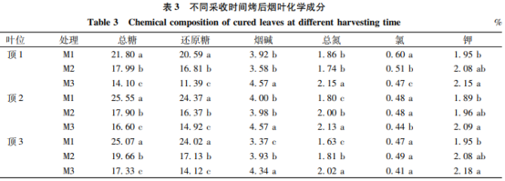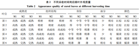 本研究認(rèn)為,湖南江華煙區(qū)烤煙上部煙葉適宜采收成熟度為M1~M2,即葉片顏色黃綠至變黃50%,部分茸毛脫落,主脈變白,支脈變白50%,葉緣微卷曲,葉尖下勾,40%的葉面出現(xiàn)成熟斑。