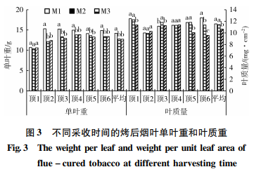 由圖3可知,頂1葉位處理之間的單葉重差異不顯著;頂2~6葉位,延遲采收時間的M2和M3處理的單葉重均顯著小于M1處理;M2、M3的單葉重較M1處理分別下降了11.1%、11.4%。頂1、5葉位的M1、M2處理的葉質(zhì)重顯著高于M3;頂2、4葉位的3個處理葉質(zhì)重差異不顯著;頂3葉位M2處理的葉質(zhì)重顯著高于M1、M3;頂6葉位的3個處理葉質(zhì)重差異顯著;M2、M3的單葉質(zhì)重較M1處理分別下降了1.1%、8.5%。以上說明,延遲采收時間會顯著降低上部煙葉重量,導(dǎo)致減產(chǎn);但也會降低葉質(zhì)重,提高煙葉的疏松性。