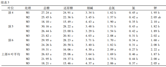 由表3可知,延遲采收時間會導(dǎo)致上部煙葉的總糖和還原糖含量下降,從頂1~6葉位,煙葉總糖和還原糖含量均是M1>M2>M3,且達(dá)到了差異顯著性水平(P<0.05),特別是部分葉位M3處理總糖含量在20%以下,不受企業(yè)歡迎。延遲采收時間,導(dǎo)致上部煙葉的煙堿含量提高,除頂3(3個成熟度處理煙堿含量差異顯著)外,頂1、2和頂4~6葉位的煙堿含量M3顯著大于M1、M2;所有處理的上部煙葉的煙堿含量均偏高,M3處理的煙堿含量在4.5%以上。延遲采收時間,導(dǎo)致上部煙葉的總氮含量顯著提高,M3處理的煙葉總氮含量顯著高于M1。延遲采收會提高上部煙葉鉀含量,從頂1~6葉位,煙葉鉀含量均是M3>M2>M1。延遲采收降低上部煙葉氯含量,M3的煙葉氯含量顯著低于M1。