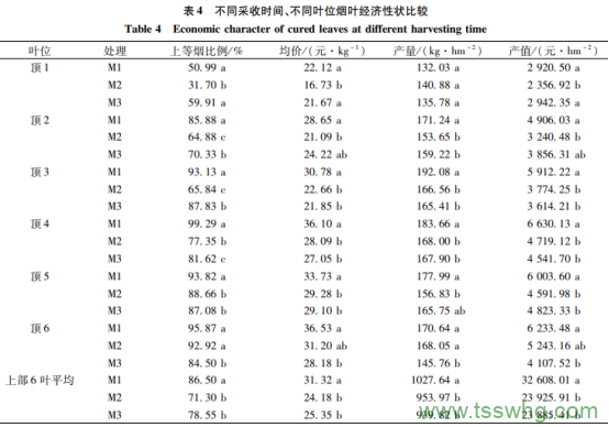 由表4可知,除頂1葉位外,M3的上等煙比例均顯著小于M1。除頂1、2葉位外,M3的均價均顯著低于M1。除頂1、5葉位外,M3產(chǎn)量均顯著低于M1。除頂1、2葉位外,M3產(chǎn)值均顯著小于M1??傮w上看,延遲采收時間,會降低上等煙比例和均價,降低產(chǎn)量和產(chǎn)值。