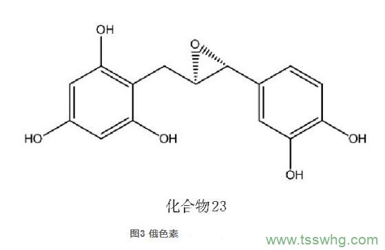 俄色葉中的芳香類化合物具有良好抗菌活性,可采用溶劑提取法進(jìn)行提取,萃取法進(jìn)行分離純化[。從俄色葉醇溶性溶劑中首次分離出1,2-環(huán)氧-1-(3,4-二羥基-苯基)-3-(2,4,6-三羥基-苯基)-丙烷,被命名為俄色素,詳見圖3。