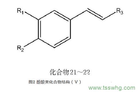 酚酸類化合物主要通過超聲輔助有機(jī)溶劑法、超臨界流體萃取法、酸水提取法、堿液提取法、酶解法、超聲微波酶解法進(jìn)行提取,采用大孔樹脂分離法、反相硅膠色譜、半自動制備型液相色譜等進(jìn)行分離純化[。從俄色葉中已分離鑒別出2種酚酸類化合物,分別是咖啡酸和對香豆酸,詳見表2、圖2。