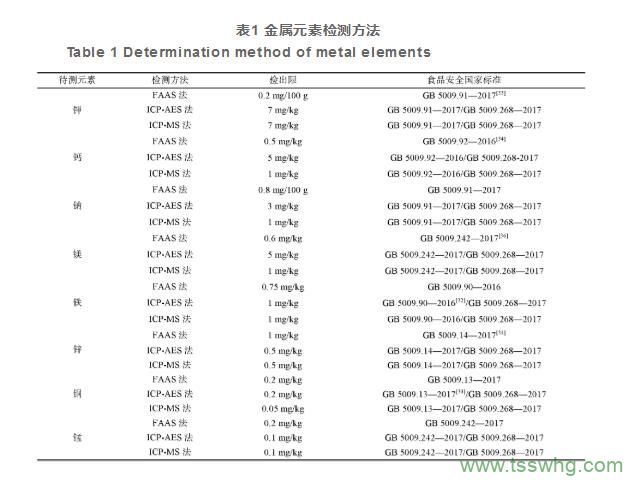 奶粉中常見(jiàn)添加的金屬元素主要包括鉀、鈣、鈉、鎂、鐵、鋅、銅、錳,這些元素的檢測(cè)方法研究文獻(xiàn)報(bào)道很多,目前常用的檢測(cè)方法已形成國(guó)家標(biāo)準(zhǔn)檢,如表1,從表中可以看出,8種元素都可以用火焰原子吸收光譜法(flameatomicabsorptionspectrometry,F(xiàn)AAS)檢測(cè),其中GB5009.268—2016《食品安全國(guó)家標(biāo)準(zhǔn)食品中多元素的測(cè)定》給出了電感耦合等離子體質(zhì)譜法(inductivelycoupledplasmamassspectrometry,ICP-MS)和電感耦合等離子體發(fā)射光譜法(inductivelycoupledplasmaatomicemissionspectrometry,ICP-AES),可以實(shí)現(xiàn)8種元素的同時(shí)檢測(cè),由于這幾種元素含量較高,目前實(shí)驗(yàn)室普遍使用電感耦合等離子體發(fā)射光譜法。