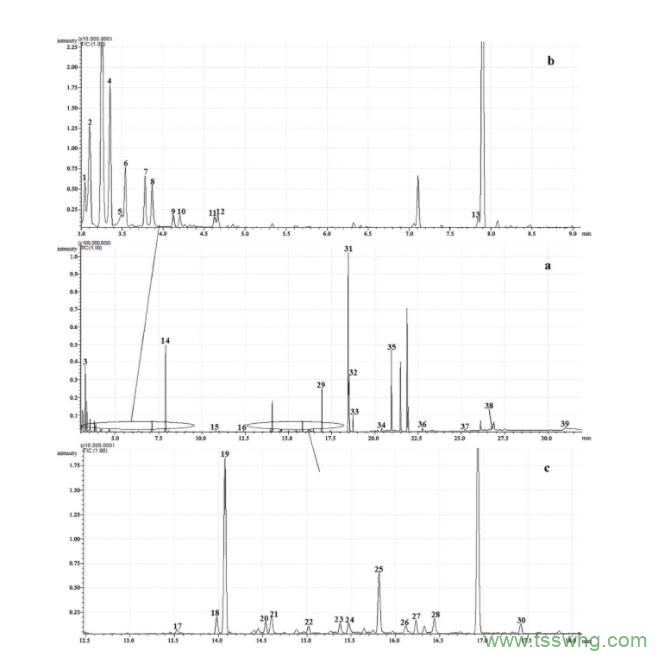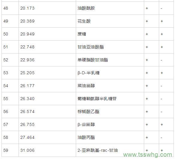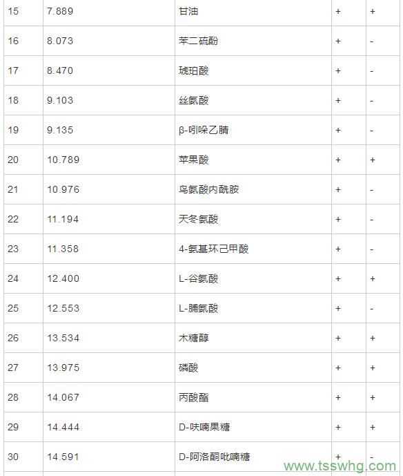 在被鑒定的全離子分析物中,乙酰酸、N-甲基丙酰胺、乙胺、巴豆醇、叔丁醇、硅醇以上化合物為衍生化試劑形成,在此不做討論。