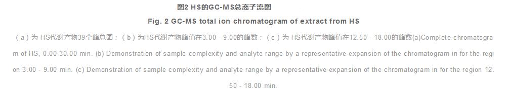 HS中含量較高(>10%)的有甘油、亞油酸、蔗糖;含量中等(2.5% ~ 10%)的有油酸、棕櫚酸、丙酸酯、正頡氨酸;含量相對(duì)較低(< 2.5%)的有硬脂酸、D-山梨醇、醋酸鹽、2-亞麻?;?rac-甘油、β-谷甾醇、甘油亞油酸酯、花生酸、磷酸、氨基甲酸酯、乳酸、氨基甲酸二乙酯、D-葡萄糖、D-吡喃半乳糖、2,2-二乙基乙酰胺、β-D-半乳糖、D-呋喃果糖、蘋果酸、L-谷氨酸、α-D-吡喃半乳糖、木糖醇。