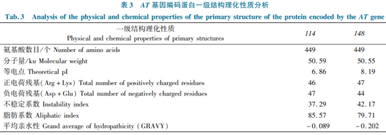 以SnapGene3.2.1分別對(duì)AT基因翻譯出來(lái)的氨基酸序列,通過(guò)ExPASy-ProtParamtool進(jìn)行理化性質(zhì)分析表明(表3),AT基因的2個(gè)拷貝114與148氨基酸均為449個(gè),分子量約50.5ku,114編碼的氨基酸偏中性而148編碼的蛋白偏堿性。不穩(wěn)定系數(shù)顯示114與148均為穩(wěn)定蛋白,且親水性較差,屬于脂溶性蛋白。