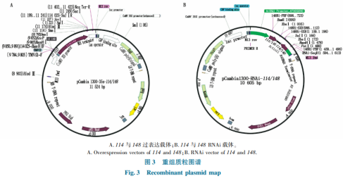 AT基因的2個(gè)拷貝114與148過表達(dá)重組質(zhì)粒見圖3-A。AT基因的2個(gè)拷貝114與148RNAi重組質(zhì)粒見圖3-B。