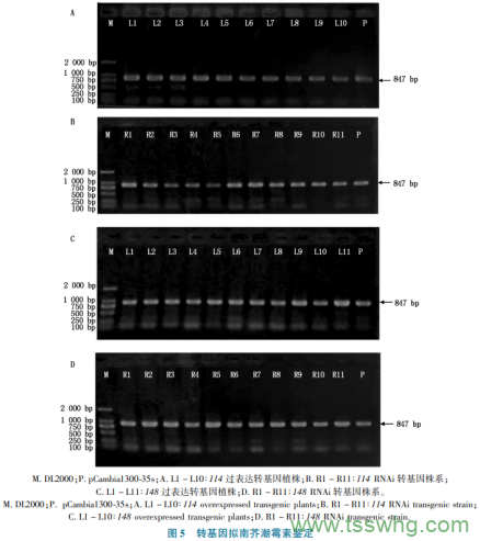 經(jīng)潮霉素篩選T0轉(zhuǎn)基因擬南芥種子后(圖4),對(duì)T1進(jìn)行pCambia1300-35s-114、pCambia1300-RNAi-114、pCambia1300-35s-148及pCambia1300-RNAi-148載體潮霉素鑒定,結(jié)果表明(圖5),目的質(zhì)粒T-DNA均已插入擬南芥基因組,表明擬南芥轉(zhuǎn)基因成功。