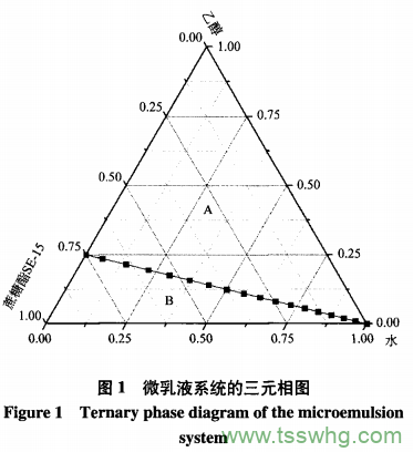 具有一定負(fù)載能力的空白系統(tǒng)微乳溶液是制備輔酶Q10高溶解度可被水完全稀釋的微乳溶液的關(guān)鍵性步驟。本研究選擇食品級(jí)的乳化劑蔗糖脂肪酸酯(HLB=15)作為乳化劑,該乳化劑既具有較好的親水性又具有一定的親油性,同時(shí)又是食品級(jí)乳化劑,可以保證最終微乳溶液的食品安全。由于蔗糖脂肪酸酯(HLB=15)是固體,需要一定量的乙醇溶解后才能使用,所以在制備空白系統(tǒng)微乳時(shí)首先要考慮蔗糖脂肪酸酯與乙醇的比例,試驗(yàn)表明當(dāng)二者質(zhì)量比為75:25時(shí)可形成均一的溶液。將水按照一定質(zhì)量比加入到二者形成的溶液時(shí),溶液沒(méi)有出現(xiàn)沉淀和分層的現(xiàn)象,表明其能夠被水完全稀釋,見(jiàn)圖1。圖1中的溶解線將區(qū)域分為A和B兩區(qū),A區(qū)為均一相溶液,即在該區(qū)域內(nèi)三種成分可以以任何一種比例形成微乳溶液。B區(qū)內(nèi)由于蔗糖脂肪酸酯占比較大,同時(shí)其又是固體,當(dāng)蔗糖脂肪酸酯的比例過(guò)大時(shí)不能完全溶解,就會(huì)出現(xiàn)非均一溶液的情況,該區(qū)域內(nèi)的三者比例組合不能形成微乳溶液,所以在制備微乳溶液中該區(qū)域內(nèi)的配方不予考慮。乳化劑是制備微乳液的關(guān)鍵,其比例越多越有利于非極性物質(zhì)的溶解,基于此并結(jié)合圖1數(shù)據(jù)點(diǎn),確定蔗糖脂肪酸酯(HLB=15)與乙醇的質(zhì)量比為75:25,所有試驗(yàn)都是沿著圖1中稀釋線75:25(75wt%SE-15和25wt%乙醇)進(jìn)行的。
