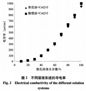 試驗分為三種情況進行,第一種情況是不加入表面活性劑和表面活性助劑,在這種情況下輔酶Q10溶解度很小,幾乎為零,可以看出輔酶Q10在食品用油中的溶解度非常有限,這也成為其應用方面的一個瓶頸。第二種情況是表1中四類試劑,前三種在一起混合時沒有加入輔酶Q10,目的是觀察食用油在表面活性劑與表面活性助劑混合物(即載體系統(tǒng)溶液)的溶解情況,試驗結果表明,兩種油在空白微乳液中的溶解量分別達到了5.7%和8.8%,其中葵花油的溶解量更多可以與葵花油所含的多不飽和脂肪酸亞油酸含量較高有關。第三種情況是在載體體系中加入了輔酶Q10,試驗結果令人振奮,輔酶Q10的溶解量分別達到了2.40%和3.80%,同時兩種油酯的溶解量也較大幅度的增加,與前面兩種情況時行比較,可以推測出食用油和輔酶Q10在空白系統(tǒng)中的溶解性有協(xié)同增效的作用。