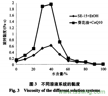 為了表征輔酶Q10微乳系統(tǒng),沿稀釋線對空白系統(tǒng)和溶解輔酶Q10微乳溶液的黏度進行了對比研究,試驗結果表明,這兩種微乳液的黏度隨著含水量逐漸增加先增加后降低,其中當含水量在30%-50%時的黏度遠遠高于其他階段的,表明該階段正處于混亂狀態(tài)的雙連續(xù)相,由于極性基團和非極性基團不能有序排列,所以黏度大幅度增大,之后隨著加水量的增加,相發(fā)生變化,黏度快速降低。從黏度圖上也可以表明,低含水量時微乳液為連續(xù)相W/O微乳液,含水量達到30%~50%時為雙連續(xù)結構相,含水量達到60%時相發(fā)生反轉,轉變?yōu)檫B續(xù)相OAV型的水包油型微乳溶液,連續(xù)相是水性的并且黏度下降。同時也說明了油包水型的微乳溶液的黏度大于水包油型的黏度,表明大分子的非極性物質是形成黏度的主要貢獻者。將兩條黏度線進行比較時就會發(fā)現(xiàn),當含水量相同時輔酶Q10微乳溶液的黏度始終大于空白系統(tǒng)的,這與輔酶Q10微乳溶液溶解較多非極性化合物有關,當是當加水稀釋至含水量達到60%時,二者黏度就相差不大了,表明此時溶解的非極性化合物對整個微乳溶液的黏度影響可以忽略了。