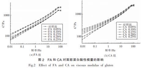 面制品的品質與面團的流變特性有很大關聯(lián),而面團中的面筋蛋白對于面團的流變特性起決定因素。采用動態(tài)流變儀可以測出面筋蛋白的彈性模量(G')以及黏性模量(G'')隨掃描頻率變化而變化的具體情況,以此推測某些物質在分子結構方面的信息。圖1、圖2分別表示添加不同含量的FA和CA后,面筋蛋白的彈性模量(G')、黏性模量(G'')的頻率掃描曲線圖。由圖1可得,FA及CA組面筋蛋白的黏彈性模量均隨掃描頻率的增加而增大。當FA添加量為0.20%和0.25%時,面筋蛋白的黏彈性模量略微高于對照組,而當添加量小于0.20%時,黏彈性模量略低于對照組;當CA的添加量為0.15%,0.20%,0.25%時,面筋蛋白的黏彈性模量略高于對照組,而當添加量小于0.15%時,面筋蛋白的黏彈性模量略低于對照組。這樣的結果可能是由于添加量太小而并未明顯影響面筋蛋白的黏彈性模量,對此可以進行做后續(xù)試驗探究其原因。