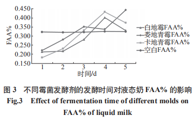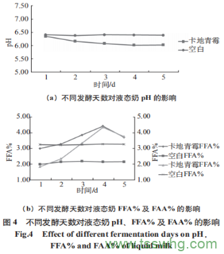 在液態(tài)奶中接種卡地青霉進(jìn)行培養(yǎng),測(cè)定pH、游離脂肪酸和游離氨基酸,研究霉菌發(fā)酵劑的發(fā)酵時(shí)間,得出結(jié)論如圖4所示。