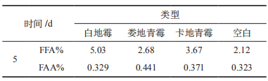 通過(guò)分析不同霉菌發(fā)酵液的pH、FFA%和FAA%,根據(jù)圖和表的數(shù)據(jù)分析,卡地青霉pH變化最后趨于平穩(wěn),達(dá)到6.03,F(xiàn)FA%和FAA%在第4天達(dá)到最佳狀態(tài),分別為4.37%和0.430%。由此得出初步結(jié)論:最佳發(fā)酵菌種為卡地青霉。