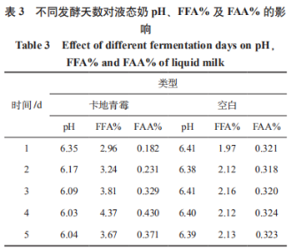 從圖4及表3中可以看出培養(yǎng)第4天,發(fā)酵奶的pH最低為6.03,且FFA%和FAA%含量均最高分別為4.37%和0.430%。因此卡地青霉發(fā)酵時(shí)間為4d。