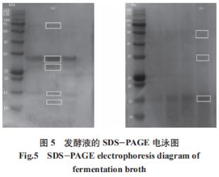 對(duì)發(fā)酵液進(jìn)行SDS-PAGE電泳實(shí)驗(yàn),(a)空白組和(b)發(fā)酵液組,得出結(jié)果如下圖所示。