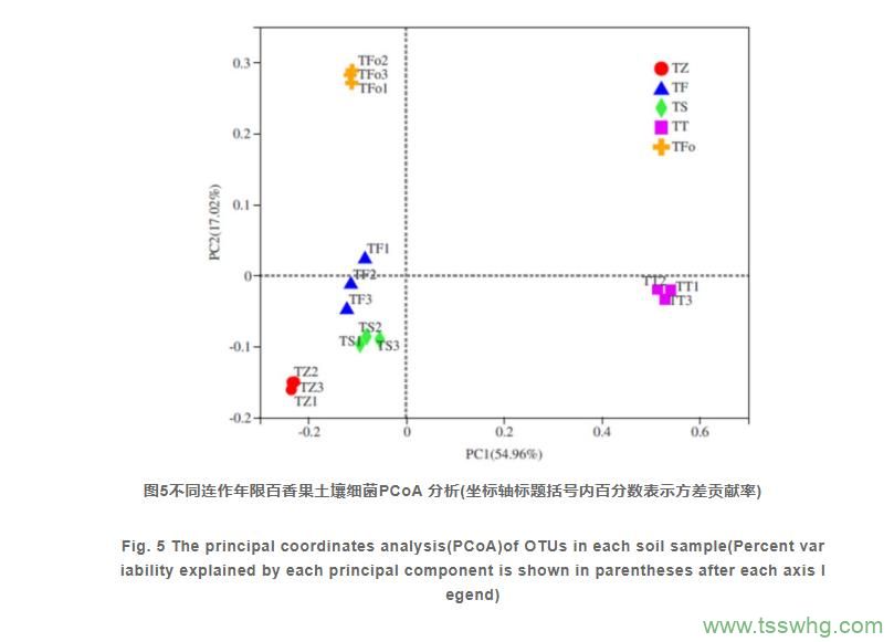 為了進(jìn)一步對(duì)細(xì)菌群落物種組成差異進(jìn)行分析,探討不同連作年限間群落細(xì)菌組成的相似性或差異性,基于Bray-Curtis距離算法,采用主坐標(biāo)分析(PCoA)對(duì)不同連作年限土壤細(xì)菌群落差異進(jìn)行分析,結(jié)果如圖5所示,在OUT水平上,PC1 與 PC2 分別解釋方差為54.96%和17.02%,累計(jì)解釋能力達(dá)71.98%,不同連作年限間土壤細(xì)菌群落差異顯著(P=0.001,R=1),撂荒地土壤樣本與百香果種植地樣本在第一主成分上很好地被區(qū)分,種植第一年(TF)與種植第二年(TS)土壤細(xì)菌群落組成較相近;每個(gè)處理的三個(gè)重復(fù)樣本的聚集性較好,顯示出較好的重復(fù)性,第一年種植的土壤細(xì)菌組內(nèi)差異較大。同時(shí),采用Bray-Curtis算法對(duì)15個(gè)土壤樣本細(xì)菌群落進(jìn)行樣本層級(jí)聚類分析,結(jié)果表明(如圖6):15個(gè)土壤樣本明顯聚集為5組,與5個(gè)連作年限對(duì)應(yīng),其中連作3年的樣本(TT)單獨(dú)為一簇,與其他4個(gè)樣本分開(kāi);第一年種植(TF)和第二年種植(TS)的樣本與撂荒地(TZ)的相似距離較近,說(shuō)明百香果連作顯著影響土壤細(xì)菌群落結(jié)構(gòu)。