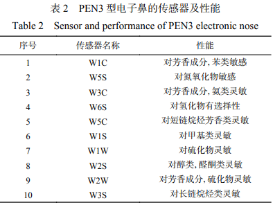 本文采用PEN3型電子鼻對葡萄桑葚復合果醋不同發(fā)酵時期進行風味成分檢測。PEN3型電子鼻設備,主要利用其具有的10個氣體傳感器來進行樣品的風味成分測定,傳感器名稱和性能見表2。將不同發(fā)酵時期果醋準確量取相同質(zhì)量20mL裝入50mL燒杯中,用封口膜密封,室內(nèi)環(huán)境為23~28℃,3組樣品各3個平行。測定參數(shù)設為5s樣品預備時間,1s樣品分隔時間,10s調(diào)零時間,100s沖洗時間,60s測定時間。