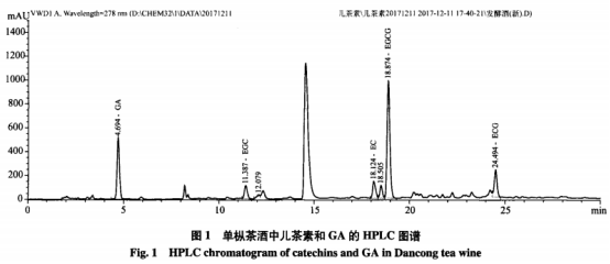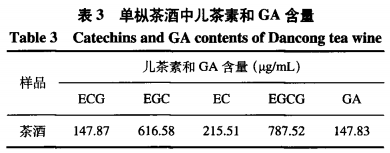 圖1為單樅茶酒中兒茶素和GA的HPLC分析圖譜,表3為計(jì)算出的單樅茶酒中的兒茶素和GA含量。